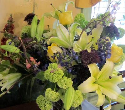 Spring is on my mind, and how fitting that my wedding of last weekend was a celebration of so many spring flowers: peonies, delphinium, ladies mantle, and roses. I had the prettiest cerise, pink, and creamy white peonies which smelled as good as they looked. The bride selected a multicolor theme of blue, pink, and lemon-lime greens, all set off by the palest of acid green silk tablecloths - perfect for a springtime wedding.
